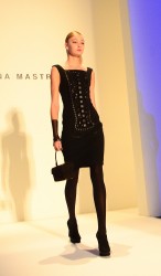 With Iris Apfel, a fashion icon, as the core inspiration for the collection, Mastroianni developed a delicate range of looks lavishly adorned with beading, metallic ornamentation, chunky jewel trimming, and feathered embellishments. She raised the glamour bar further by accompanying many looks with ornate evening gloves. The collection epitomizes looks that Apfel might wear on her travels around the globe. The finale not only included a stunning backless, silver “chain-mail” gown –which appeared to require cautious steps by the model sporting the look– but Apfel, herself, joined the designer on stage for a touching moment of honor and appreciation.-Ana Pavlovic