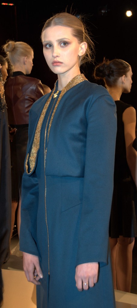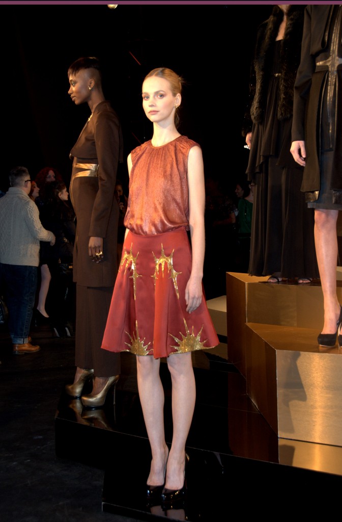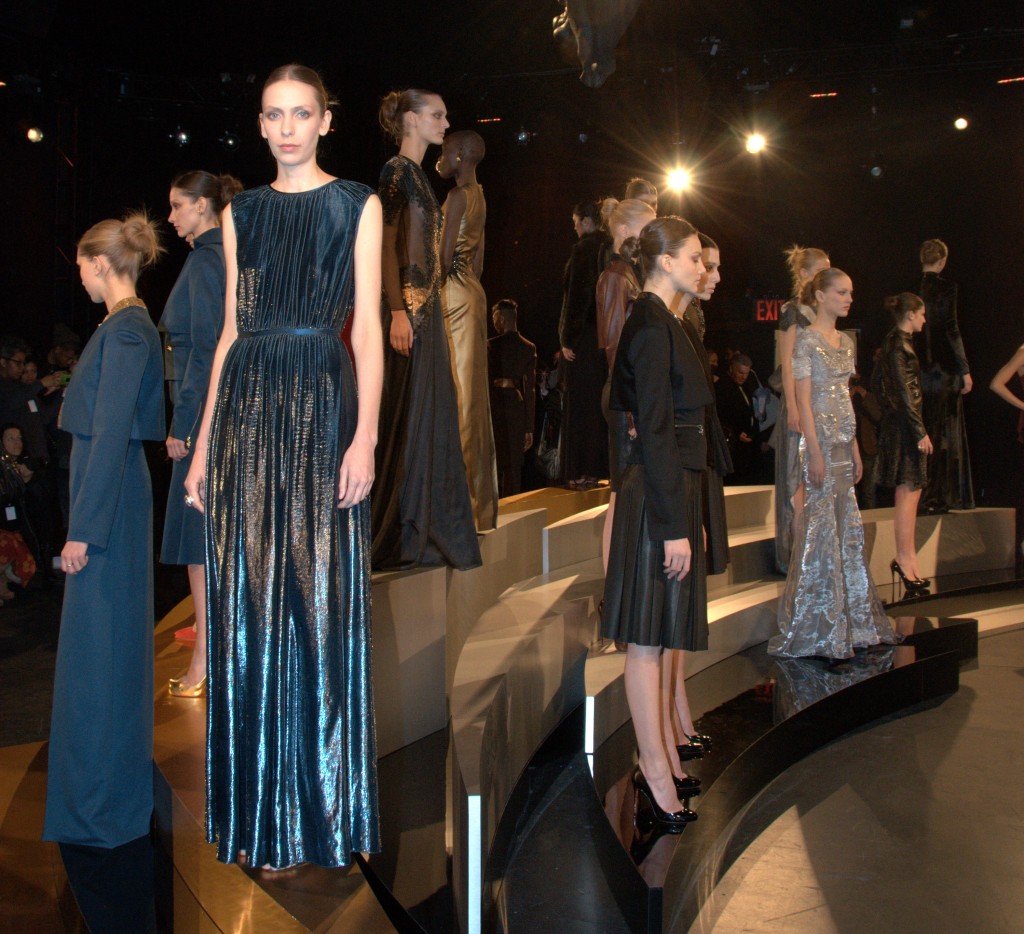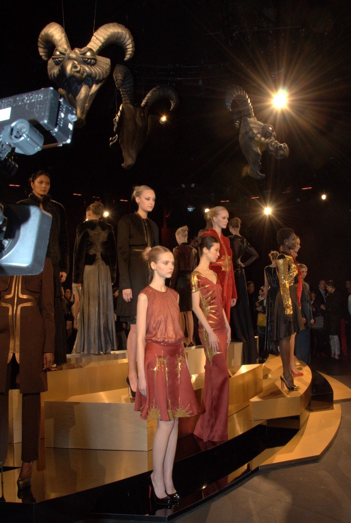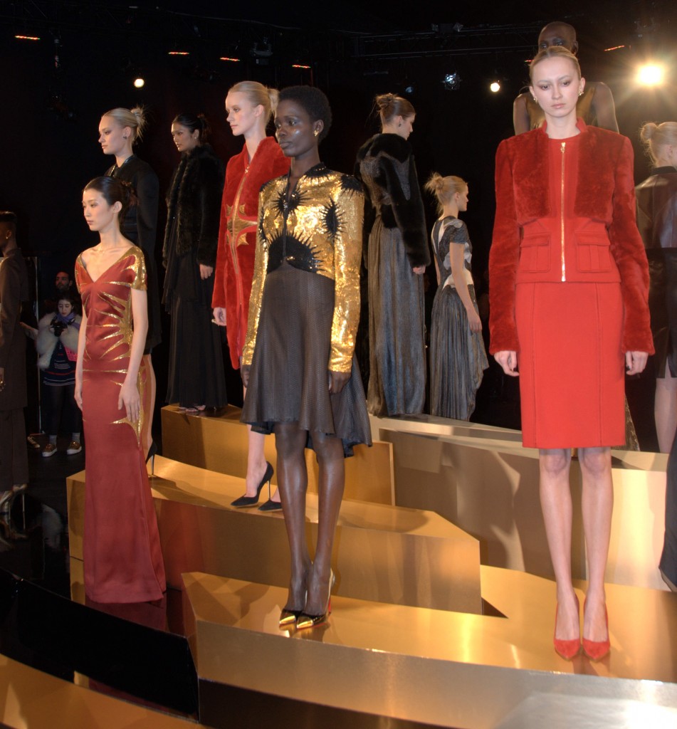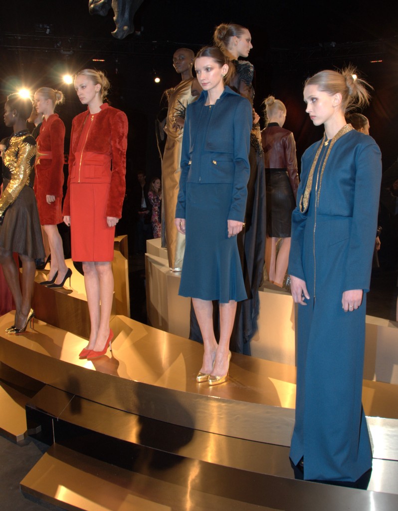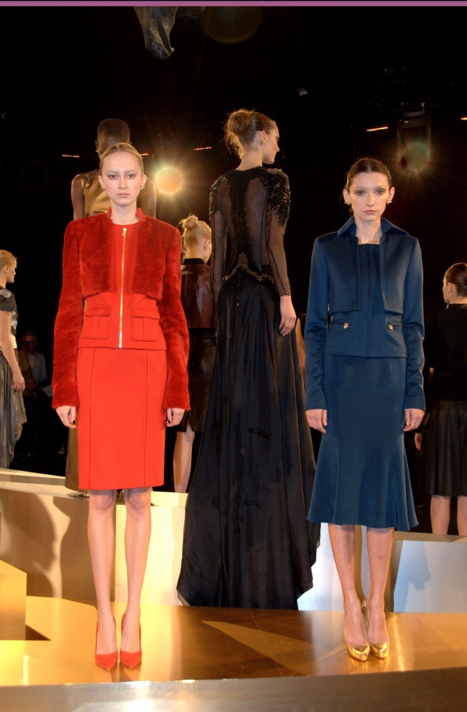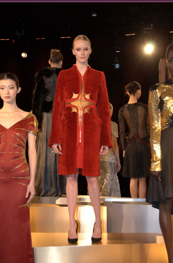 The collection consisted of a regal evening gown and dress collection that evoked a hint of Russian princess. The castle-like atmosphere was further accentuated with classical music in the background and oversize gargoyle statues suspended above the models. Looks ranged from bright, angular, military structured dress and jacket combos to a long, black velvet gown that conceals the skin but amply reveals body form. The designer also incorporated leathers and furs as well as the all-too-popular metallics for this season, in particular an eye-grabbing gold.